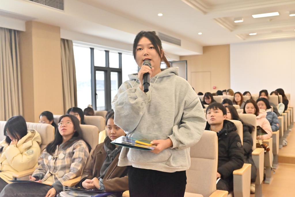 当大屏幕亮出“您眼中的智慧城市DNA是什么?”“未来职场需要怎样的π型人才?”“您应该如何适应这场数字化浪潮?”等三个思辨议题时,同学们热情地举手分享和表达自己的想法。郭嘉明耐心地解答了同学们关于AI如何影响学习、工作和生活等相关问题,指出数字化的浪潮已经席卷全球,同学们应该紧跟时代步伐,响应国家号召,注重自身全面发展。