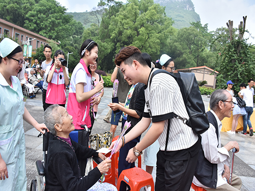 5月13日上午八点,多名获国家资助的学生和学院各年级的青年志愿者以及励合社的成员们在励合社社长团助理徐瑞艳的带领下,来到桂林市夕阳红养老院进行志愿服务,为老人们献上节日的祝福。