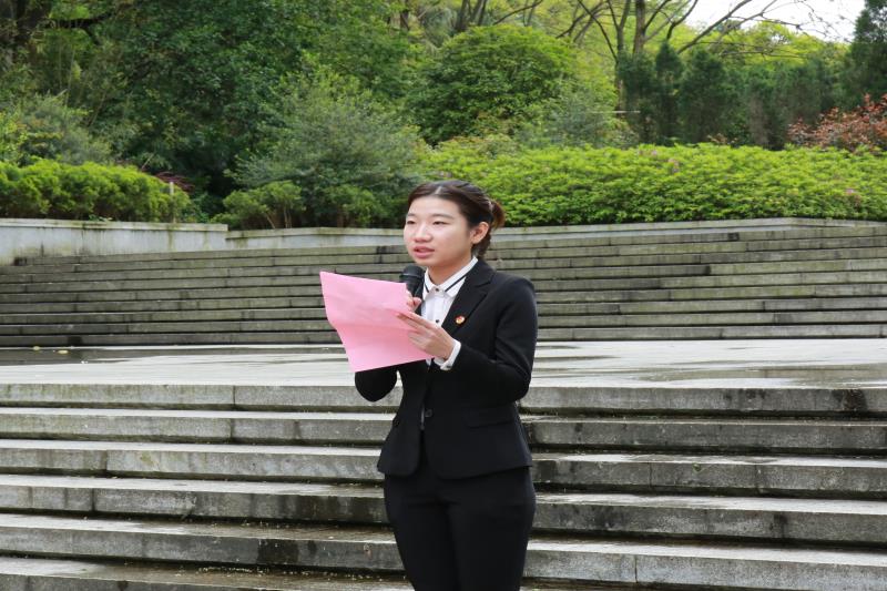 活动伊始,由校团委学生副书记谭明灿讲解本次活动的背景与目的,并宣布烈士祭扫仪式开始。奏唱国歌后,材料科学与工程学院团委书记赵思聪老师介绍了烈士英雄事迹,意在让同学们铭记历史,铭记英雄精神。接着,全员默哀一分钟,在庄严肃穆的仪式中接受精神洗礼。随后,中国·yL23411永利学生骨干代表王昕怡发言,她倡议当代大学生应当自觉学习革命英雄事迹,继承和弘扬爱国主义精神,为实现中华民族伟大复兴的中国梦而努力奋斗。随后,土木与建筑工程学院团委书记姚慧老师带领全体学生骨干重温入团誓词。最后,我校团委副书记莫媛老师进行讲话,她对在场的所有学生骨干指出了三点希望:一是要缅怀革命先烈,传承红色精神;二是要牢记历史使命,弘扬爱国精神;三是要胸怀远大理想,同心共筑中国梦。至此,本次清明祭扫活动圆满结束。