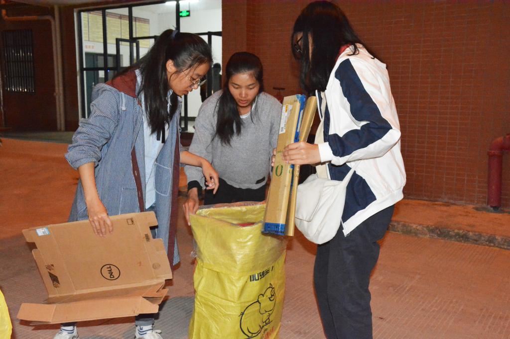 志愿者分为13组来到学生宿舍进行回收,同学们早早将纸板、塑料制品等废品整理好等待志愿者的到来,积极帮助志愿者进行废品装袋;随后,志愿者们将收集好的废品打包搬到宿舍楼底空地,按纸箱、饮用塑料瓶、易拉罐、有色塑料瓶等对收集废品完成分类整理。志愿者们不怕脏不怕累、挽起衣袖、鼓足干劲地开展工作,忙碌身影成为了一道亮丽的风景线。在2018级同学们的大力支持下,志愿者们的齐心协力下,本次回收活动高效、圆满完成。
