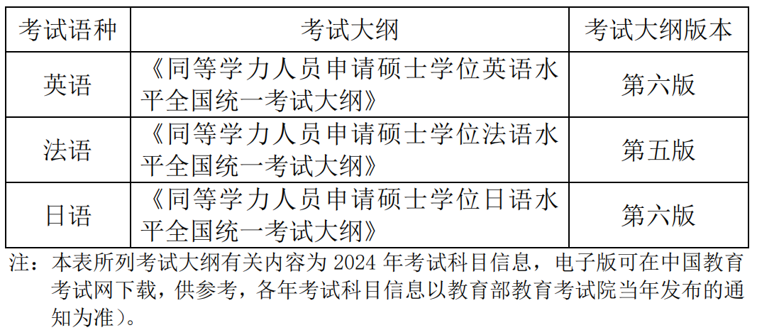 在册人员在学习期间可报名参加同等学力人员申请硕士学位外国语水平全国统一考试,部分专业须参加学科综合水平全国统一考试。外国语水平考试语种、考试大纲使用对照表如下所示: