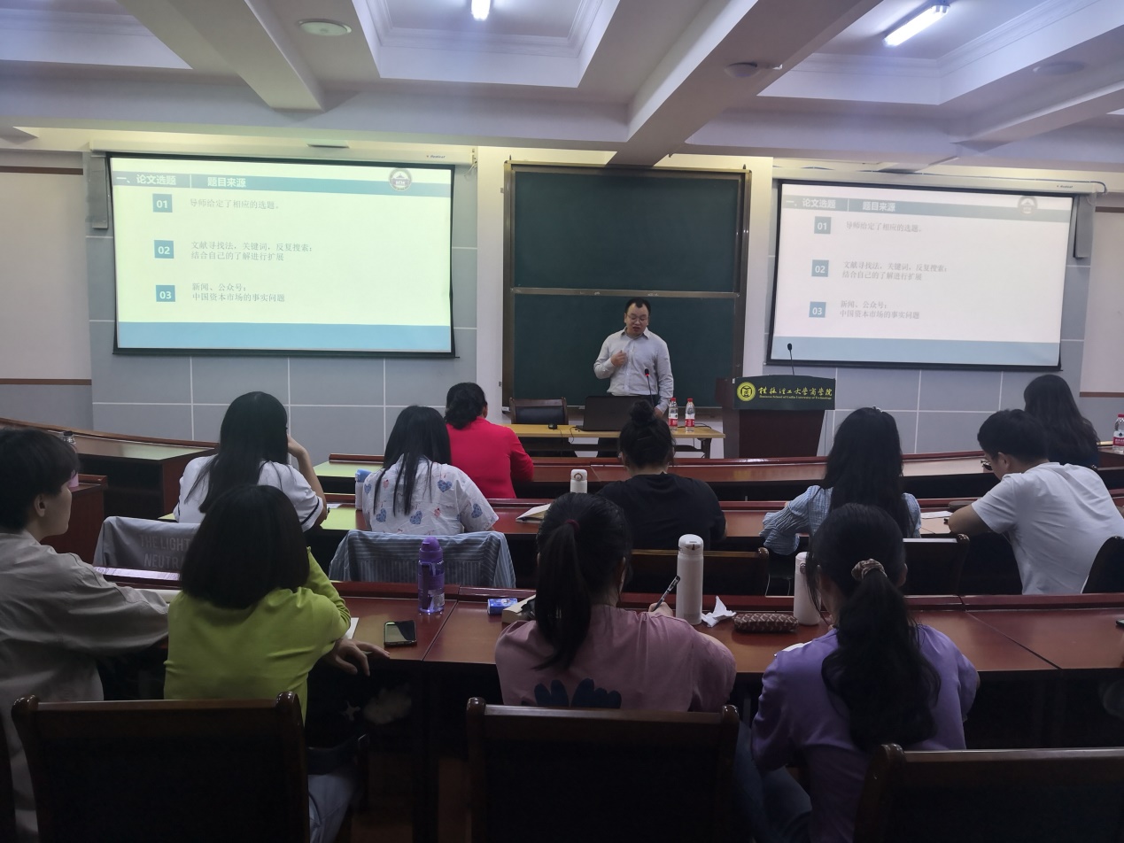 林副教授从论文选题方法、理论及论文数据来源、框架等方面对不同方面的论文的写作提出了建议,包括案例论文和实证分析论文。结合实际论文,进行了深入浅出的演讲。最后林副教授与同学进行分享和答疑,解答了同学的困惑,分享了自身写作的灵感,在座的同学获益匪浅。