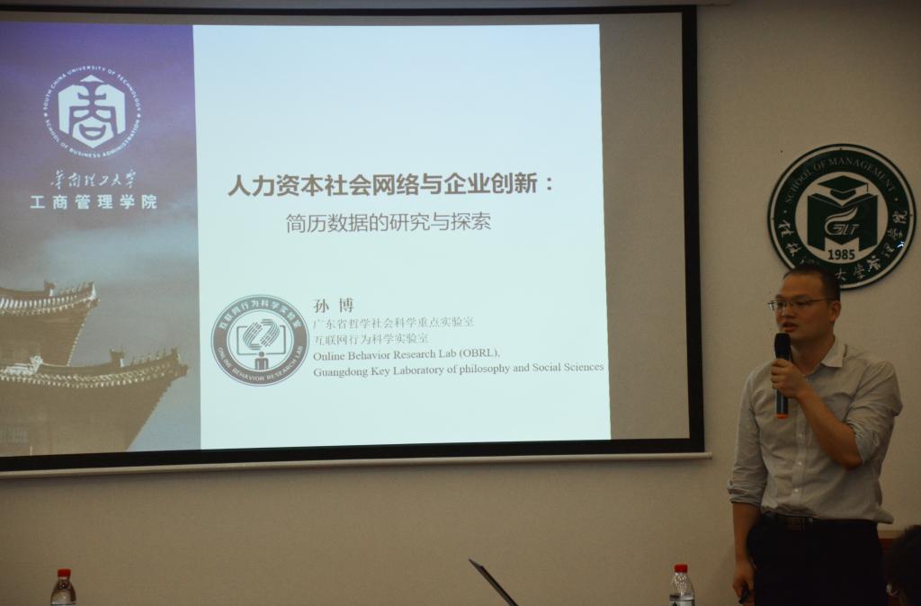 刘善仕教授先从大数据时代背景入手,阐述了人力资源大数据的来源、生产过程与内容以及理论与研究框架。随后,刘教授从个体层次的实证研究、组织内部层面的实证研究、组织间的实证研究、区域层面的实证研究这四个层面充分论述了人力资源管理到底可以做哪些方面的研究。他强调,做大数据研究,方法就是文本分析加上机器学习,要求我们不断归纳总结、层层论述、深入探讨,才能结出研究果实。最后,刘教授与大家分享了其基于简历大数据的人力资源管理研究课题的研究成果,并与在场师生开展了深入和富有成效的交流。他团队当中的两名博士生也做了分享,孙博分享了今年在《管理世界》发表的题为《人力资本社会网络与企业创新:简历数据的研究与探索》的研究论文,另一名博士生周怀康分享了正在进行的题为《谁在助推房价?基于中国流动人力资本的经验证据》的研究论文,引起了大家对人力资源管理研究极大的兴趣与关注。