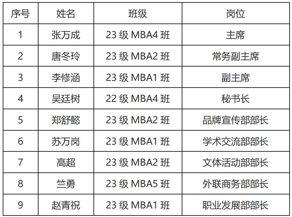 根据《yl23411集团MBA联合会章程》和《yl23411集团第五届MBA联合会换届选举办法》要求,经个人申请、资格审查、公开演讲、集中评议,产生了第五届MBA联合会成员,现将名单公示如下: