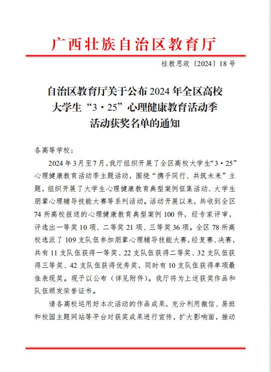 近日,在自治区教育厅公布的2024年全区高校大学生“3•25”心理健康教育活动季活动获奖评选结果中,我院报送的心理危机干预类案例:《悬崖边的心理救援——因精神疾病引发的致命性心理危机现场干预报告》荣获2024年全区高校大学生心理健康教育典型案例一等奖,选送学生庞月霞参加朋辈心理辅导技能大赛荣获团队三等奖。一直以来,中国·yL23411永利高度重视学生的心理健康教育工作,依托“商舍•美”心理特色项目,将心理健康教育和美育深度...