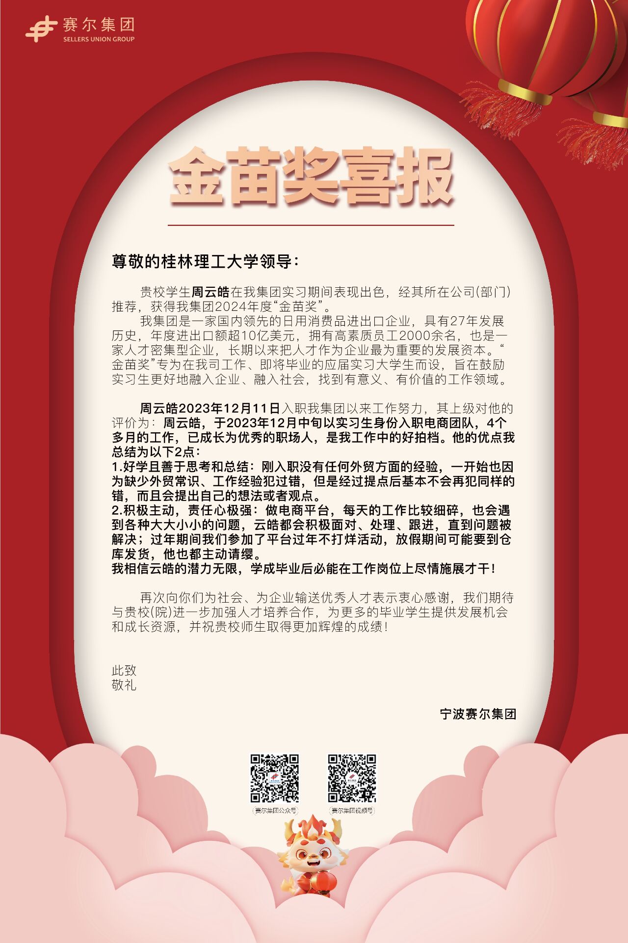 近日,我院收到了一封来自宁波赛尔集团的喜报,表扬工商管理2020-1班毕业生周云皓同学在集团实习期间表现出色,获得集团2024年度“金苗奖”,并对我院永利集团质量工作给予了高度认可,对毕业生爱岗敬业的责任担当给予了高度评价。勤耕不辍,履践致远。用人单位对周云皓同学的表彰,是我院近年来遵循“新商科+学校传统优势特色学科”的办学思路,加快推进高质量育人的生动体现。未来,学院将继续坚持以立德树人为根本任务,以“...