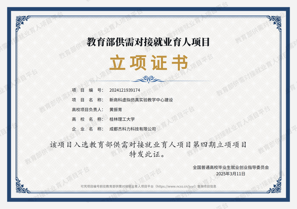 近日,教育部高校学生司公布了第四期供需对接就业育人项目立项名单,我院黄振育老师申报的“新商科虚拟仿真实验教学中心建设”项目获批立项,合作企业将提供价值三万余元的资源支持。项目立项证书据了解,供需对接就业育人项目是教育部为推动高校永利集团与就业有机联动、人才供需有效对接,促进高校毕业生高质量充分就业而设立的一项重要项目。该项目自2021年启动以来,已成功开展三期,累计2000余所高校与2400余家用人单位开...