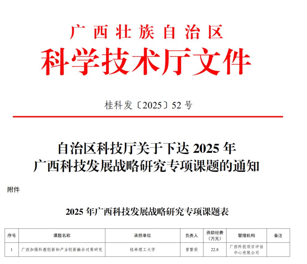 近日,自治区科技厅发布了《自治区科技厅关于下达2025年广西科技发展战略研究专项课题的通知》(桂科发〔2025〕52号),全区共有17项课题获批。其中,曾繁荣教授牵头申报的“广西加强科教创新和产业创新融合对策研究”获批立项,资助经费22.8万元,是我校今年唯一获批的该类项目。据悉,广西科技发展战略研究专项课题主要围绕广西实施创新驱动发展需要,为建设创新型广西,加快推进科技振兴,开展科技发展战略、科技政策法规、...