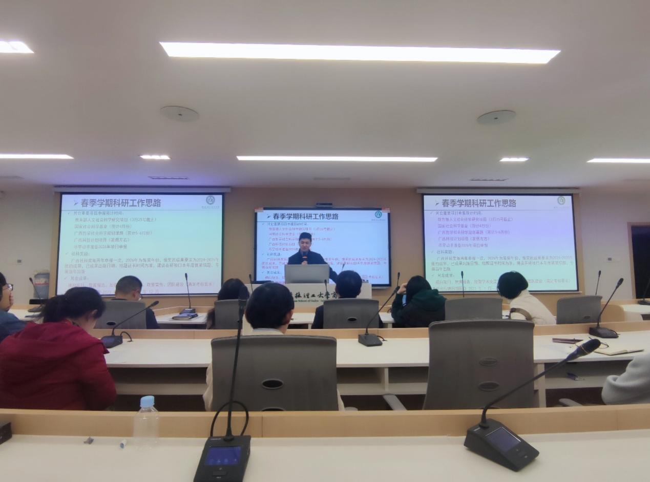 3月21日上午,学院在7311会议室召开2025年度春季学期科研工作会议,部署新学期科研重点工作。副院长廖帅出席会议并讲话,各教研室、实验室相关负责人参加会议。会上,廖帅通报了各教研室2025年国家自然科学基金项目的申报情况,分析了教育部人文社会科学项目和国家社会科学基金项目申报形势。针对春季学期科研任务,他要求,各教研室要充分发挥组织力量,组建团队,发挥学术凝聚力,在基金申报工作中“抱团取暖”反复打磨申请书...
