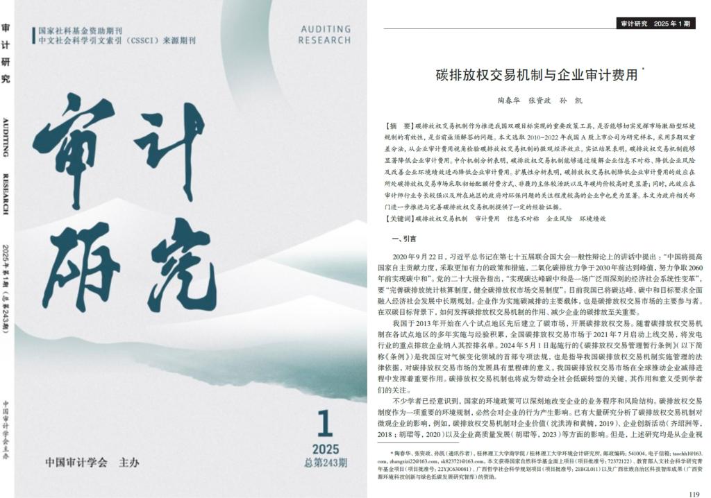近日,我院陶春华老师团队在碳排放权交易领域的研究取得新进展,研究成果以《碳排放权交易机制与审计费用》为题,在国家社会科学基金资助期刊《审计研究》期刊2025年第1期发表。《审计研究》是由审计署主管、中国审计学会主办、国内外公开发行的权威性审计学术刊物,双月刊,创刊于1986年。《审计研究》2012年入选国家社会科学基金资助期刊,是CSSCI中文社会科学引文索引来源期刊,中国知网(2024版)复合影响因子为9.816。论文...