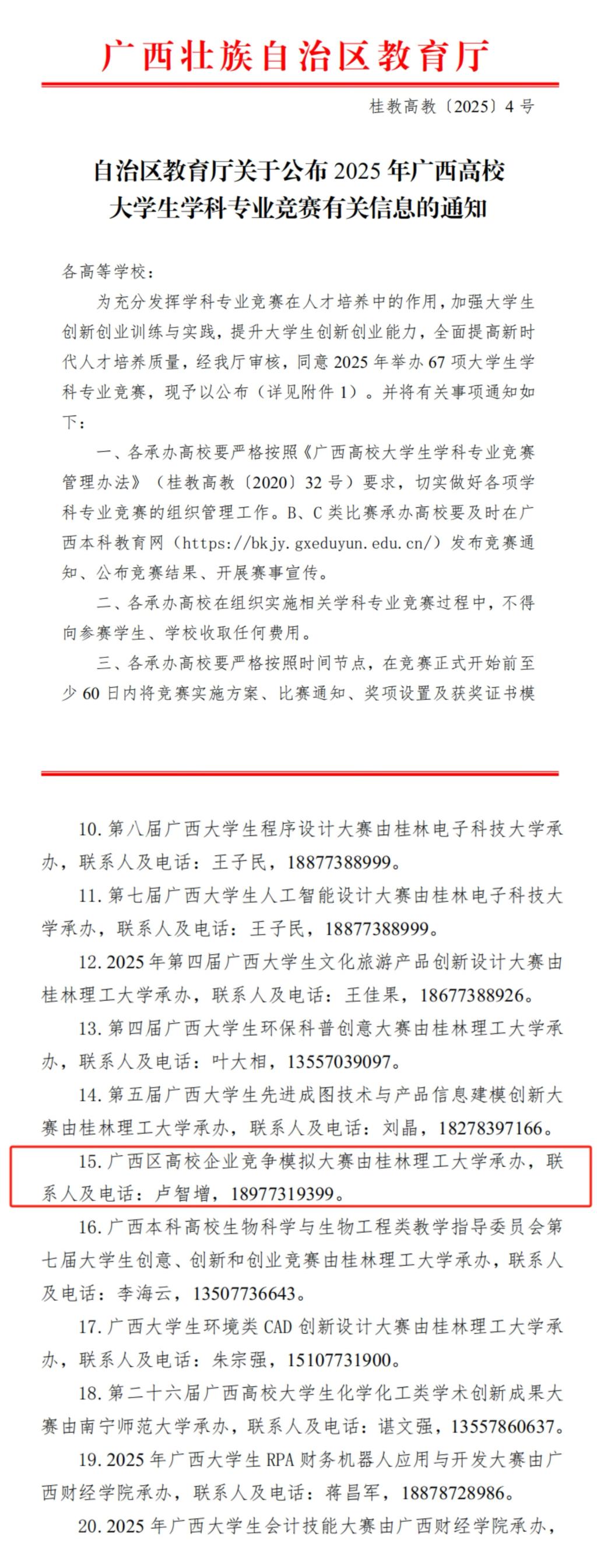 近日,自治区教育厅下发通知(桂教高教[2025]4号),公布了2025年广西高校大学生学科专业竞赛有关信息,我院申报并承办的“广西区高校企业竞争模拟大赛”成功入选《广西2025年大学生学科专业竞赛项目名单》。企业竞争模拟大赛是面向高校大学生的具有中国特色的重要商业模拟竞赛,是中国高等教育学会发布的《全国普通高校大学生竞赛分析报告》竞赛项目之一。截至2024年12月,全国企业竞争模拟大赛(研究生组)已成功举办了22届,...