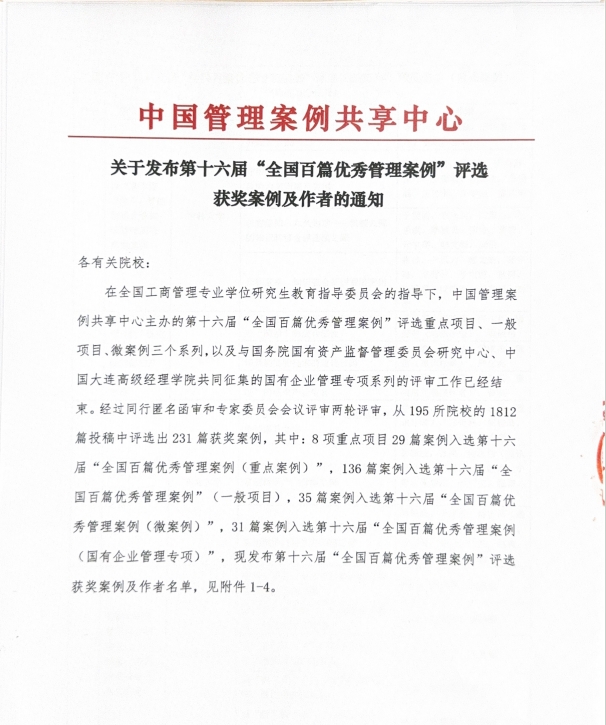 2025年9月10日,中国管理案例共享中心主办的第十六届“全国百篇优秀管理案例”评选结果公布,由我院李进生副教授和陈亮教授团队合作撰写的管理案例“制度筑基,文化铸魂:力源集团企业文化建设之路”成功入选全国“百优”管理案例,取得了管理案例研究与开发工作的重要进展,为学院“十四五”收官增添重要成果。“全国百篇优秀管理案例”是全国工商管理案例领域的最高奖项,并先后纳入教育部2012年第三轮学科评估指标体系(C5指...